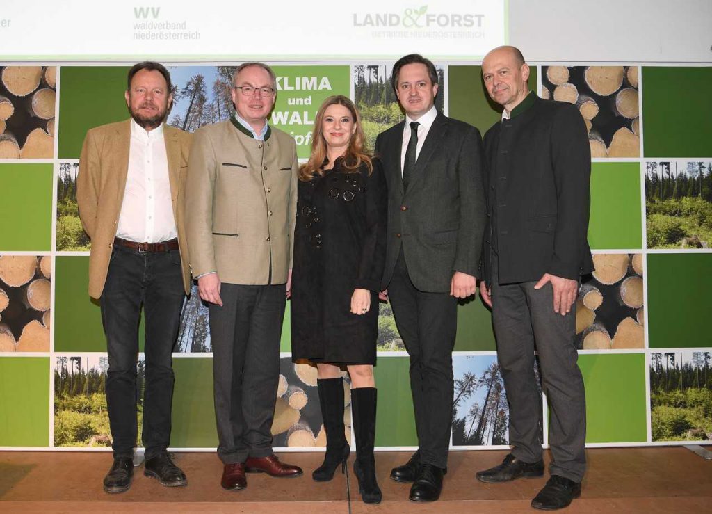 Im Bild: Obmann der Land&Forstbetriebe Niederösterreich Markus Hoyos, LH-Stellvertreter Stephan Pernkopf, Moderatorin Christa Kummer, Landwirtschaftskammer NÖ-Präsident Johannes Schmuckenschlager und Obmann des Waldverbandes NÖ Franz Fischer.