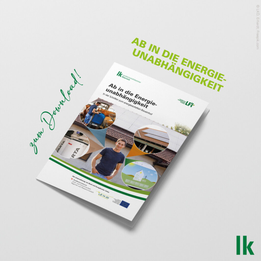 Die neue Broschüre „Ab in die Energieunabhängigkeit“ liefert eine Anleitung, wie Land- und Forstwirt:innen ihren Betrieb energieautark machen können. Im Vordergrund stehen dabei vier Aspekte: Effizienz, Erzeugung, Energiemanagement und Einspeicherung. Das Nachschlagewerk ist vom LFI in Zusammenarbeit mit den LK erarbeitet worden.