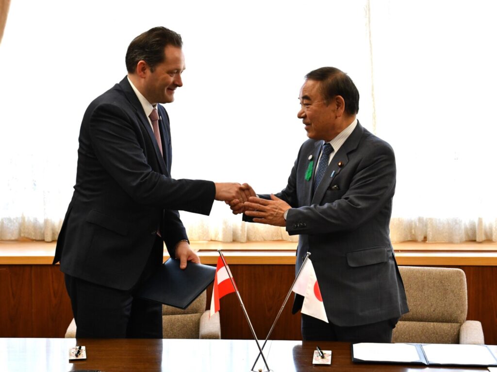 Bundesminister Norbert Totschnig und sein japanischer Kollege Tetsushi Sakamoto unterzeichneten im Zuge einer Delegationsreise nach Japan ein Memorandum of Understanding zur verstärkten Zusammenarbeit in der Forst- und Holzwirtschaft sowie der holzbasierten Wertschöpfungskette. Ziel der Absichtserklärung ist der verstärkte Austausch und Wissenstransfer zu Themen wie forstliche Aus- und Weiterbildung, Holzbau, Naturgefahrenmanagement, holzbasierte Bioökonomie sowie der nachhaltigen Bewirtschaftung und multifunktionalen Nutzung der Wälder und deren Anpassung an den Klimawandel.