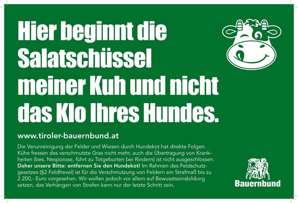 Unter dem Slogan „Hier beginnt die Salatschüssel meiner Kuh und nicht das Klo Ihres Hundes“ hat der Tiroler Bauernbund bereits 2015 eine Facebook-Kampagne gestartet, um humorvoll auf die Problematik hinzuweisen. Damit wurden mittlerweile 2 Mio. Menschen erreicht. „Es ist unseren Bauern sehr wichtig, das gute Miteinander zu wahren und gleichzeitig auf den Ernst der Lage hinzuweisen“, meint Bauernbund-Direktor Peter Raggl und fügt hinzu: „Die Felder sind keine öffentlichen Flächen, sondern Eigentum der Landwirte. Per Gesetz ist das Betreten von Grünlandflächen – im Gegensatz zum Wald – nicht erlaubt, weil es sich um Privateigentum handelt. Es geht uns jedoch nicht darum, das Begehen zu verbieten oder sofort zu rechtlichen Schritten zu greifen. Verhalten sich Hundehalter rücksichtsvoll und achten darauf, dass ihr Vierbeiner nicht das Gras verschmutzt oder niedertrampelt gibt es keine Probleme.“