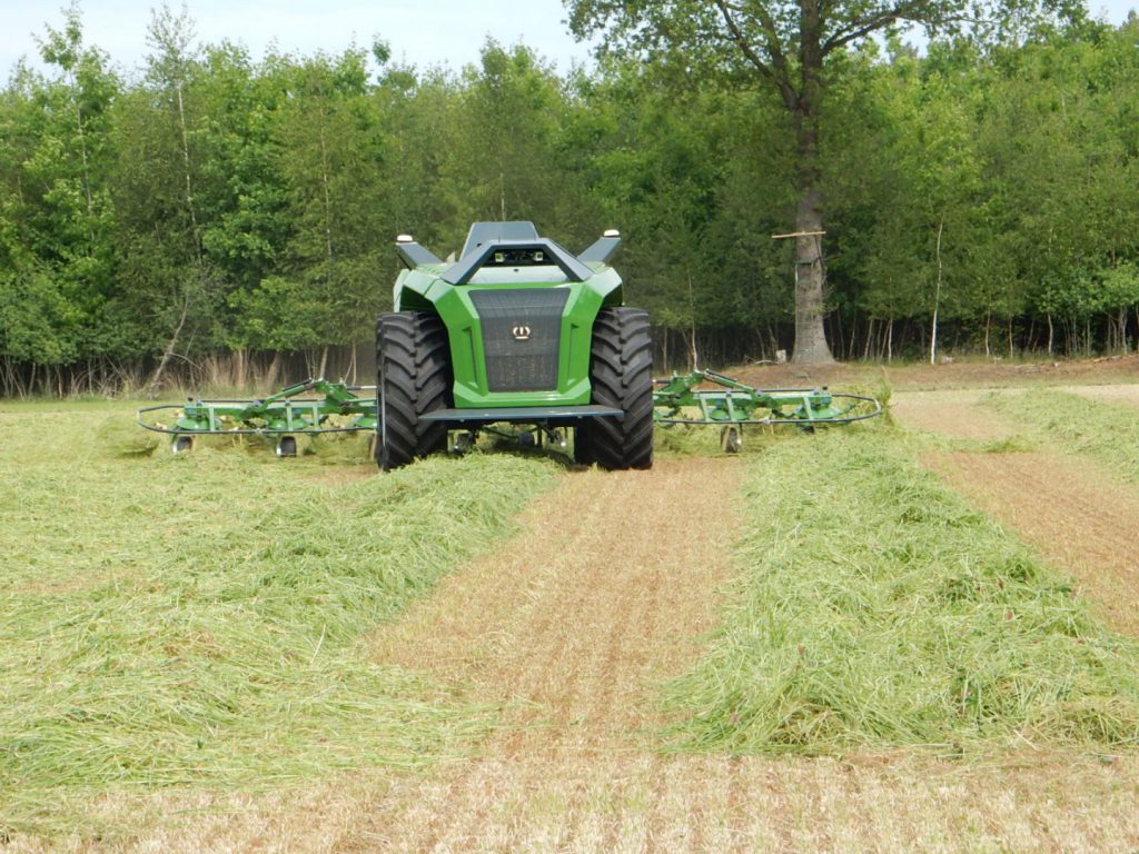 Bei der Vorführung im Feld waren die Gespanne in der Lage, eine gut einen Hektar große Fläche fahrerlos zu mähen. Anschließend erledigt die Verfahrenstechnische Einheit – kurz VTE – ebenso tadellos in konkurrenzfähiger Geschwindigkeit und Fehlerlosigkeit das Kreiseln.