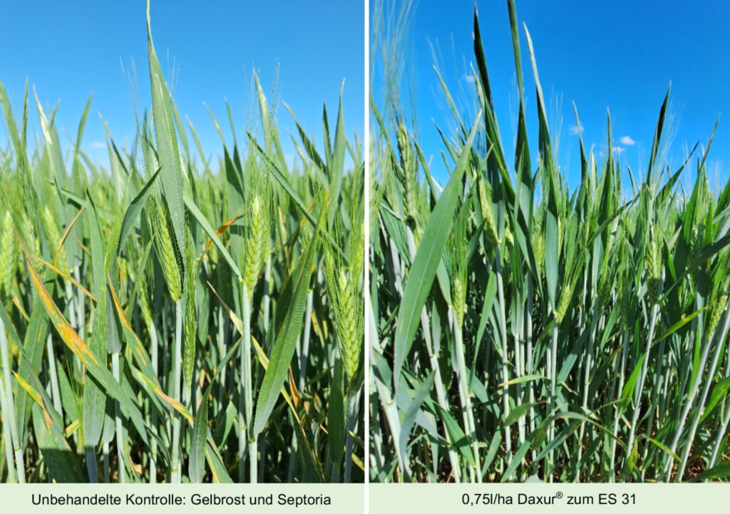 Daxur® ist für eine breite Palette an Getreidearten wie Weizen, Dinkel, Gerste, Roggen und Triticale zugelassen. Seine Wirksamkeit gegen eine Vielzahl von Pathogenen – darunter Halmbruchkrankheit, Mehltau und Rost – wurde in umfangreichen Feldversuchen in Österreich eindrucksvoll nachgewiesen. Besonders hervorzuheben ist die ausgezeichnete Leistung bereits bei frühen Anwendungen ab BBCH 31. Die flexible Aufwandmenge von 0,75-1,0 l/ha passt sich den individuellen Bedürfnissen an und erleichtert den Einsatz in der Praxis.