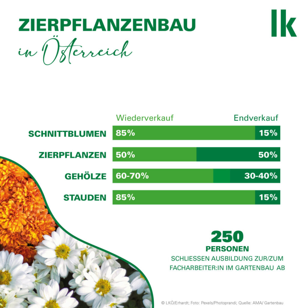 Im Zierpflanzenbau produzieren 519 Gärtnereien auf 341 ha. Für die Monate April bis Juni werden ca. 35 Mio. Beet- und Balkonblumen, 20 Mio. Gemüsepflanzen und Setzlinge und 3 Mio. Topfkräuter erzeugt. 55% der Zierpflanzen und 14% der Schnittblumen werden im Endverkauf direkt an die Konsumentinnen und Konsumenten gebracht. Bei Schnittblumen ist der wichtigste Handelspartner der Lebensmitteleinzelhandel, gefolgt von Floristikfachgeschäften. Zierpflanzen werden an Gartencenterketten, Baumärkte, andere Gartenbaubetriebe und den Lebensmittelhandel geliefert.