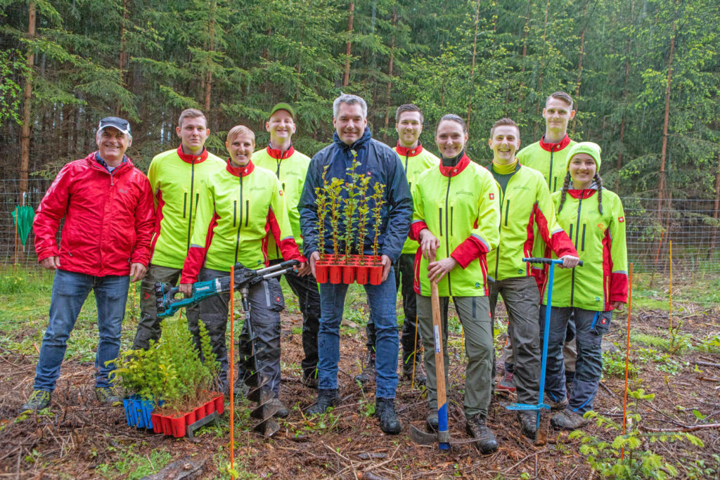Bundeskanzler Karl Nehammer stattete am 16. Mai 2023 der Plattform waldsetzen.jetzt einen Besuch ab – stimmigerweise in einem Waldstück in der Nähe von Waidhofen an der Thaya. Trotz strömenden Regens ließ es sich der Spitzenpolitiker nicht nehmen, selbst Hand anzulegen. Mit dem Erdbohrer bereitete er das Pflanzloch vor und setzte dann eine kleine Weißtanne, die „Bundeskanzlertanne“ – im Beisein des waldsetzen.jetzt-Teams und von Vertretern der lokalen Politik.