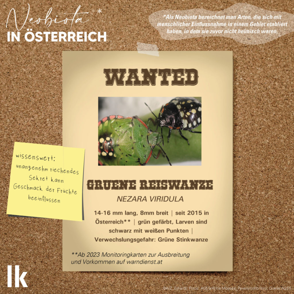 Im Vorjahr häuften sich Meldungen über die Grüne Reiswanze. Um die Situation zu überwachen und bäuerlichen Betrieben in den betroffenen Regionen zu Pflegemaßnahmen raten zu können, starten AGES und die Landwirtschaftskammern ein Reiswanzen-Monitoring im Rahmen des Pflanzenschutz-Warndienstes.