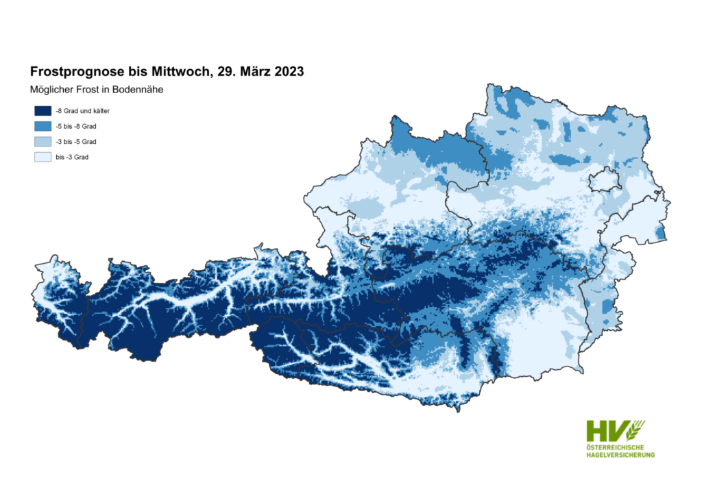 Der prognostizierte Frost gibt vor allem Obstbauern Anlass zur Sorge. Gab es vergangene Woche noch stellenweise Temperaturen um die 20 °C, ist heute am 27. März ein Temperatursturz eingetreten. Bis Mittwoch warnen Meteorologen vor Frostnächten, was insbesondere die Landwirtschaft beunruhigt. Obstkulturen, vor allem die Marille, stehen bereits an besonders warmen und geschützten Standorten in Vollblüte. So ist beispielsweise in der Wachau die Vegetation um mehr als 14 Tage früher als im 10-jährigen Durchschnitt. „Die Winter werden aufgrund des Klimawandels immer milder, wodurch auch die Vegetation immer früher einsetzt. Aufgrund der zu erwartenden Frostnächte und der fortgeschrittenen Vegetation werden die nächsten Tage – zumindest aber bis Mittwoch – in manchen Regionen Österreichs kritisch“, warnt Mag. Barbora Stuhl, Meteorologin und Klimatologin der Österreichischen Hagelversicherung.