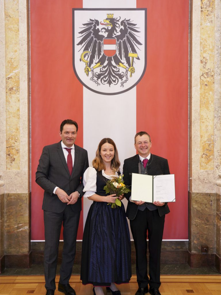 Minister Norbert Totschnig im Auftrag des Bundespräsidenten dem Landwirtschaftskammerrat a.D. und UBV OÖ Landesobmann-Stellvertreter Hannes Winklehner die höchste Berufsauszeichnung für Landwirte verliehen.