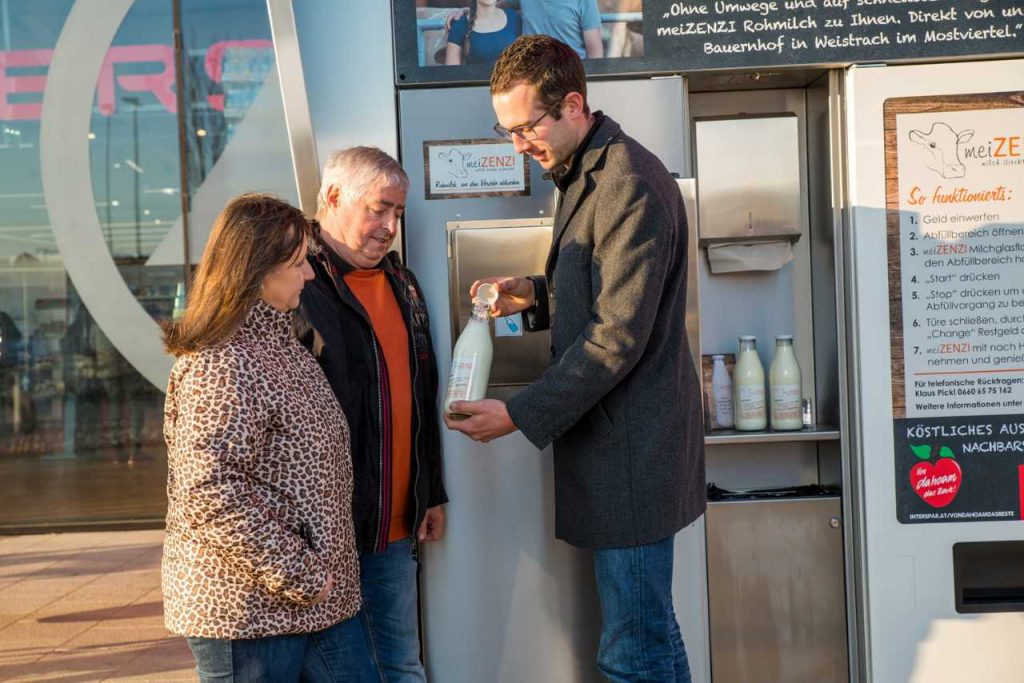 Die Milch der 34 Milchkühe vom Familienbauernhof meiZENZI von Klaus Pickl und seiner Freundin Anette wird täglich zwei Mal gemolken, filtriert und innerhalb kürzester Zeit auf unter 4 Grad Celsius gekühlt. Konstant niedrig temperiert wird die Milch auf schnellstem Wege vom Landwirt persönlich zu den Automatenstandorten in Wels und Linz-Wegscheid gebracht. „Der vollmundige und cremige Geschmack hat die Kunden sofort überzeugt. Anette und ich sind oft beim Milchautomat und bekommen so die direkte Rückmeldung der Menschen. Häufig sehen wir, dass Kunden innerhalb kürzester Zeit noch einmal am Milchautomat erscheinen. Dabei hören wir immer, dass die Milch so gut schmeckt, dass die Milchglasflasche gleich wieder leer ist“, erzählt Klaus Pickl vom großen Andrang. Durch das Engagement des Familienbauernhofs meiZENZI und Interspar, wird aber nicht nur die Regionalität gefördert. Durch das Mehrwegsystem werden Transportwege reduziert und Tetrapackverpackungen gehören somit in vielen Haushalten der Vergangenheit an.