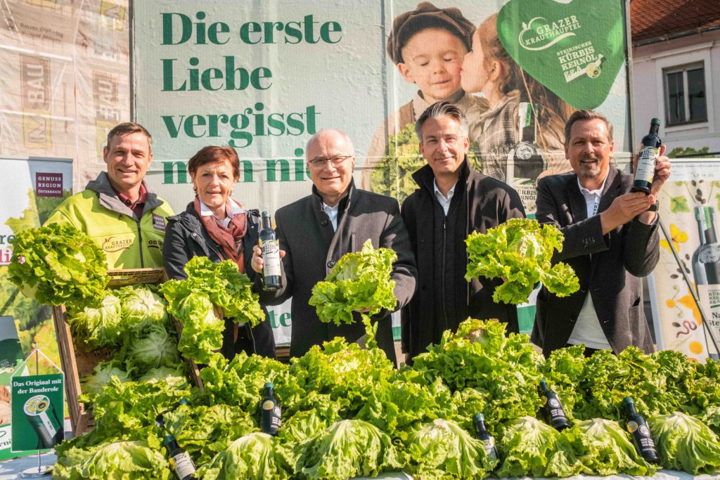 Für den heimischen Genuss darf das Steirische Kürbiskernöl g.g.A nicht fehlen“, betont LK-Vizepräsidentin Maria Pein, bei der heutigen Vorstellung der Kooperation zwischen Genuss Region Grazer Krauthäuptel und Gemeinschaft Steirisches Kürbiskernöl g.g.A. am Lendplatz in Graz.