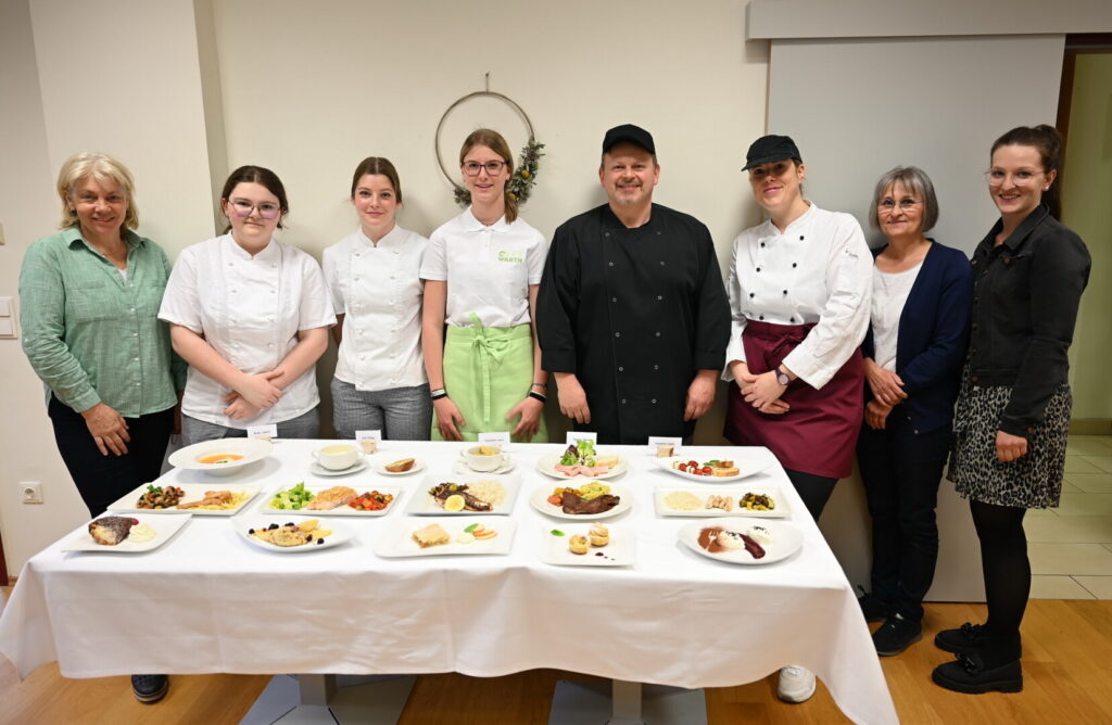 „Das Motto lautete dieses Jahr ‚Delikat in Warth‘, wobei man besonderes Augenmerk auf die Verwendung saisonaler Produkte legte. Ebenso achtete man auf die Herkunft und eine möglichst geringe Verpackung der Lebensmittel“, betont die Fachlehrerinnen Theresa Binder und Daniela Smutny, die für die Durchführung verantwortlich zeichnen. „Dabei galt es ein dreigängiges Menü für sechs Personen zu kochen, das fachgerecht serviert wurde. Angefangen von der Zusammenstellung der Speisenfolge bis hin zum Einkauf der Produkte und der Zubereitung, führten die jungen Köchinnen und Köche alle Arbeiten selbst durch. Auch auf eine dekorative Tischgestaltung sowie den Blumenschmuck wurde spezieller Wert gelegt“, so die Binder und Smutny.