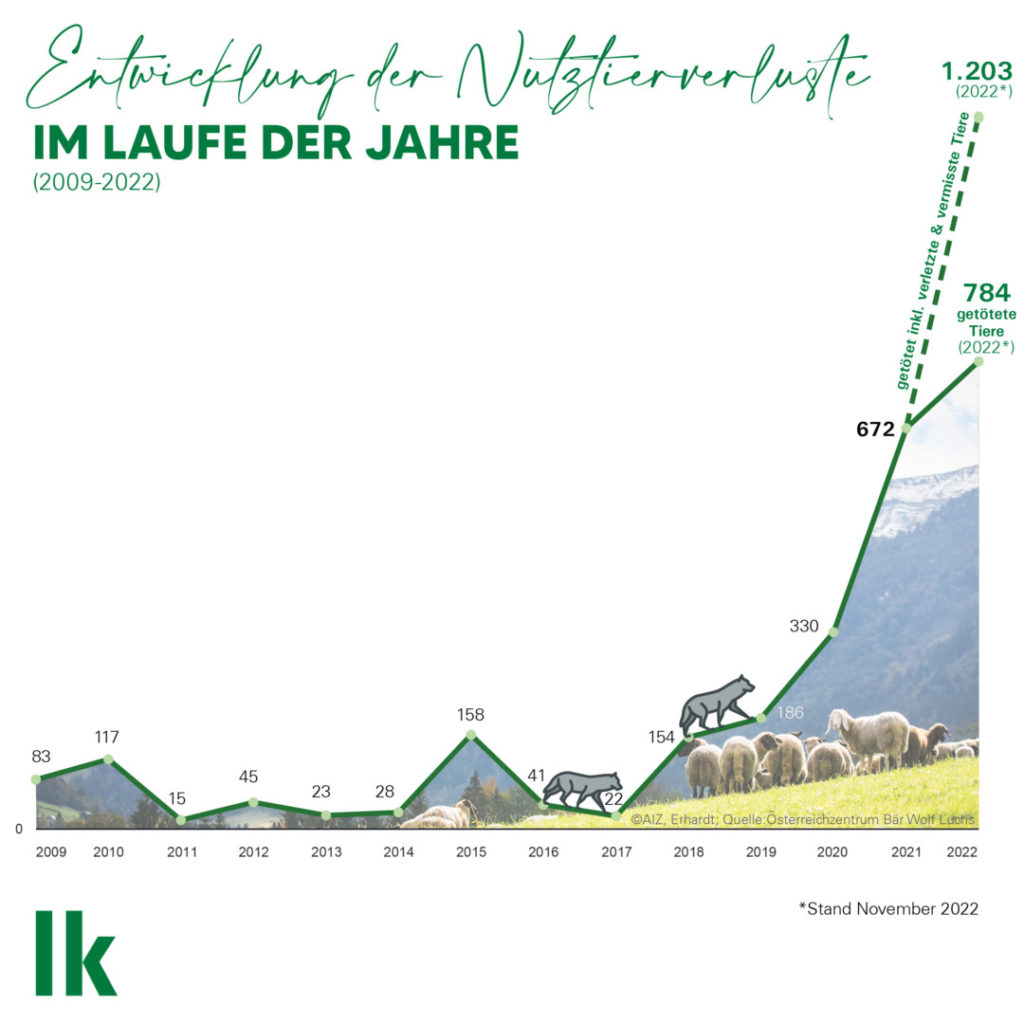 „Die Ministerin verschließt die Augen vor der Realität komplett und vertritt auf politischer Ebene eine praxisferne Raubtierromantik, die nicht im Interesse Österreichs ist. Sie scheint vielmehr in ihre früheren Tätigkeitsbereiche zurückzudriften. Wir brauchen jedoch eine Ministerin und keine einseitige Lobbyistin“, kritisiert der LKÖ-Präsident. „Ich möchte die Umweltministerin auffordern, hinaus in die Praxis zu gehen und sich ein realistisches Bild von der Situation unserer Bauernfamilien und ihrer Tiere zu machen. Immer scheinheilig von Tierschutz zu sprechen und gleichzeitig lebend ausgeweidete Lämmer, Kühe und andere oftmals langsam verblutende Tiere auf den Almen in Kauf zu nehmen, werden wir so nicht zur Kenntnis nehmen“, so Moosbrugger, der auf die exponentiell steigenden Wolfsrisse in Österreich und die dramatische Situation in manchen Nachbarländern wie der Schweiz hinweist. Der von manchen als Allheilmittel angepriesene Herdenschutz gilt als wenig wirksam und ist für viele unleistbar.
