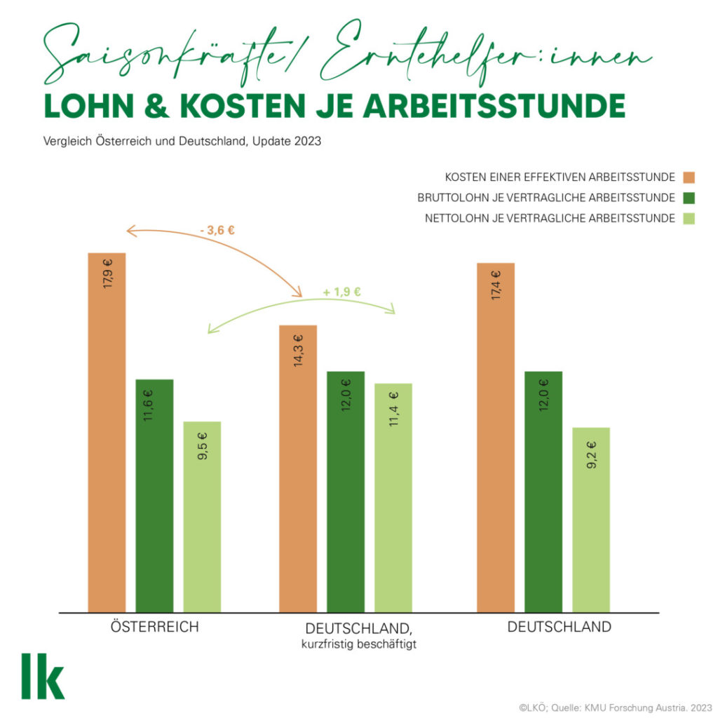 „Im Zuge der Studie wurden deutliche Wettbewerbsnachteile bei den Arbeitskosten sichtbar. So liegt Österreich bei den Bruttolöhnen für unbefristete Arbeitskräfte in der Landwirtschaft an dritthöchster Stelle nach der Schweiz und Deutschland und bei befristeten Hilfskräften bzw. Saisonkräften sogar an zweiter Stelle nach der Schweiz. Dasselbe Ranking zeigt sich auch im Hinblick auf den Bruttolohn je vertraglicher Arbeitsstunde. Für die heimischen Betriebe kommt erschwerend hinzu, dass diese in Österreich besonders hohe personalbezogene Abgaben entrichten müssen. Österreich hat mit 29,2% den zweithöchsten Anteil an Sozialabgaben auf Seiten der Arbeitgeber – hinter Italien“, berichtet Studienleiter Wolfgang Ziniel, der mit seinen Kolleginnen und Kollegen auch die Situation in Italien, Spanien, Ungarn und Polen unter die Lupe genommen hat.