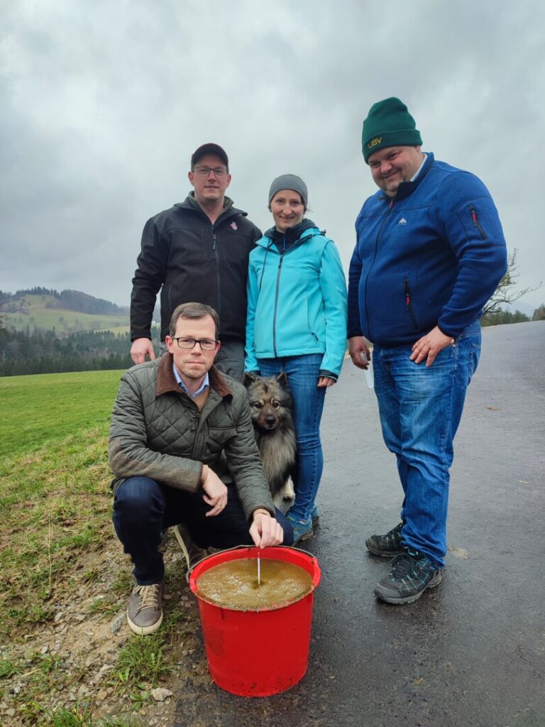 Treffen am Betrieb Franz und Barbara Zöchner in Hainfeld im Bezirk Lilienfeld. Blubbernd mixt das Rührwerk die Gülle im Behälter auf. Die Geruchsbelastung dabei bleibt auch direkt über der Grube überschaubar. „Weil ich die Gülle mit Wasser verflüssigt habe“, ist Milchbauer Zöchner überzeugt. Er senkt seit 2022 die Trockensubstanz um 50 Prozent ab und zeigt mit einem Hydrometer vor, wie er das misst. Den für Rindergülle normalen Trockensubstanzgehalt von TS 10% reduziert er auf TS 5%, bevor er diese auf den umliegenden Wiesen ausbringt. Aus der verdünnten Gülle gast dann viel weniger Ammoniak aus, der wertvolle Dünger bleibt erhalten und Umwelt und Nachbarn werden weniger belastet, ist der Landwirt überzeugt.
