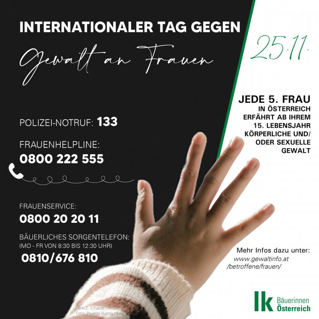 “Es sind keine Einzelschicksale, es kann jede von uns treffen. Wir dürfen nicht länger schweigen und wegschauen. Betroffene Frauen brauchen unsere Unterstützung, um ihre Angst zu überwinden und Hilfe anzunehmen“, plädiert Bundesbäuerin Irene Neumann-Hartberger für einen offenen Umgang mit dem Thema geschlechtsspezifische Gewalt.
