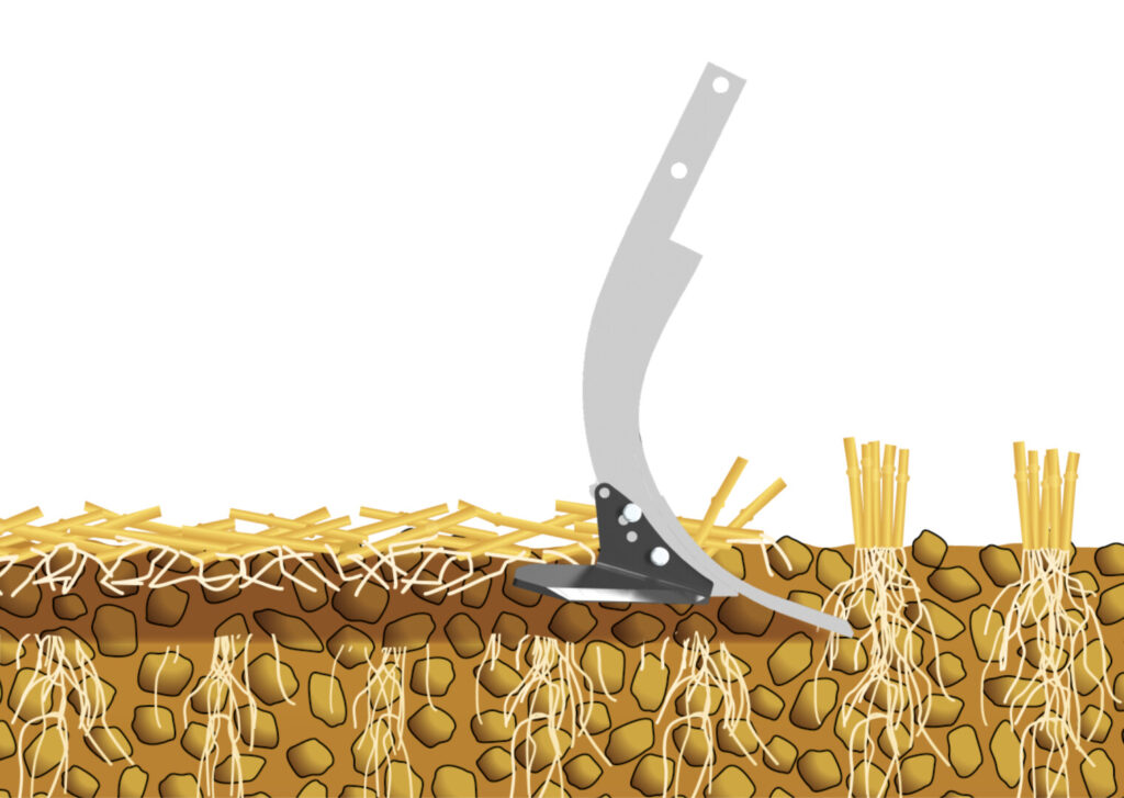 Je nach Einsatzgebiet und Bodenverhältnis lässt sich das Flügelschar in unterschiedlichen Höhen und Anstellwinkeln am Zinkenstiel montieren. Für das flache Schneiden von Getreidestoppeln wird das Flügelschar in dem untersten Lochbild an den Zinken montiert. Dadurch steht das Flügelschar fast parallel zum Boden, wodurch ein flaches Arbeiten von 5 cm bis 15 cm erreicht werden kann.