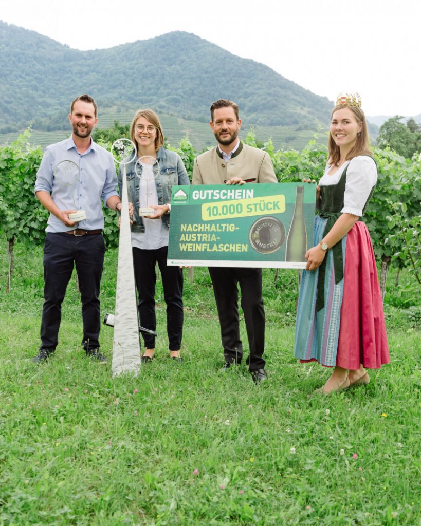 Die „Nachhaltig Austria“-Weinflaschen bestehen zu 80 Prozent aus Altglas und punkten vor allem mit ihrem Gewicht. Bei einer Million Flaschen kann das Gesamtgewicht um 50 Tonnen Glas reduziert werden. Zudem werden dadurch insgesamt 34 Tonnen CO2 sowie Transportkosten eingespart. Die Flasche wurde dafür mit dem Green Packaging Star Award 2016 in der Kategorie „Firmenstrategie/-philosophie“ ausgezeichnet