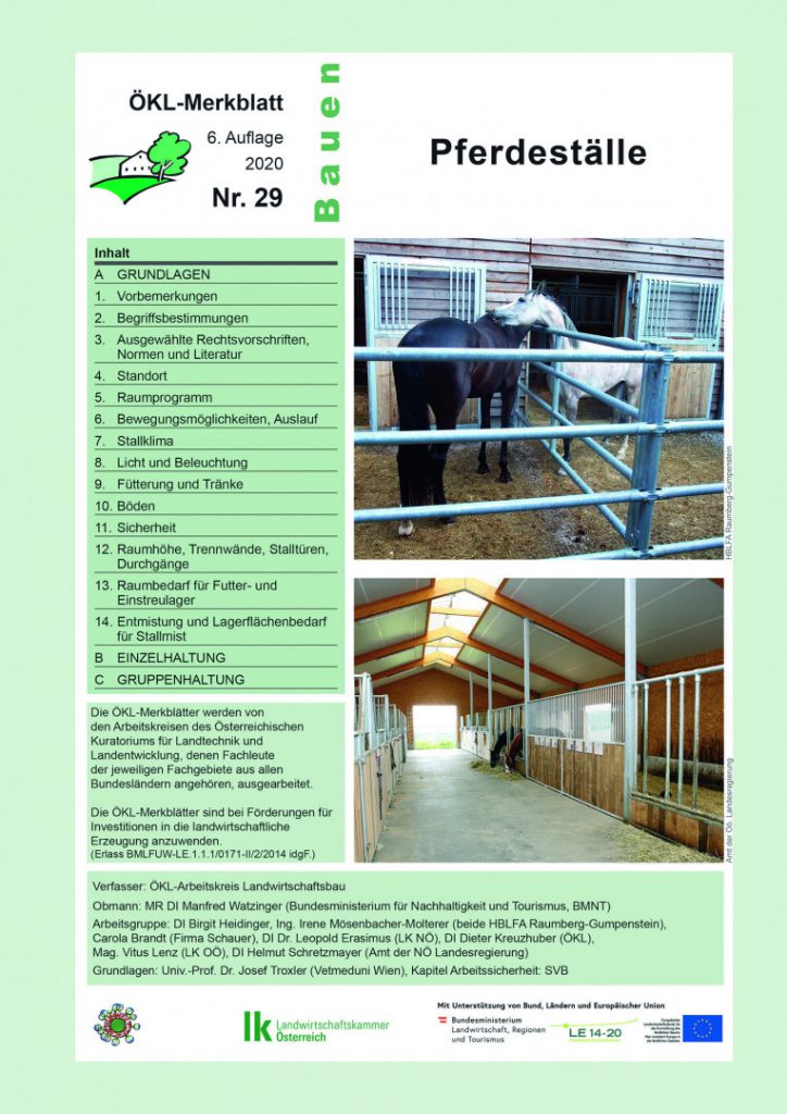 Das im Rahmen des ÖKL-Arbeitskreises „Landwirtschaftsbau“ erstellte ÖKL-Merkblatt Nr. 29 „Pferdeställe“ gibt wichtige Informationen betreffend Standort, Bewegungsmöglichkeit und Auslauf, Stallklima, Fütterung und Tränken, Böden, Elektroschutz, Raumhöhe, Trennwände, Stalltüren, Durchgänge. Außerdem sind Angaben zum Raumbedarf für Futter- und Einstreulager sowie der Lagerflächenbedarf für Stallmist enthalten. Die Einzelhaltung in Boxen sowie Varianten der Gruppenhaltung werden in Zeichnungen dargestellt.