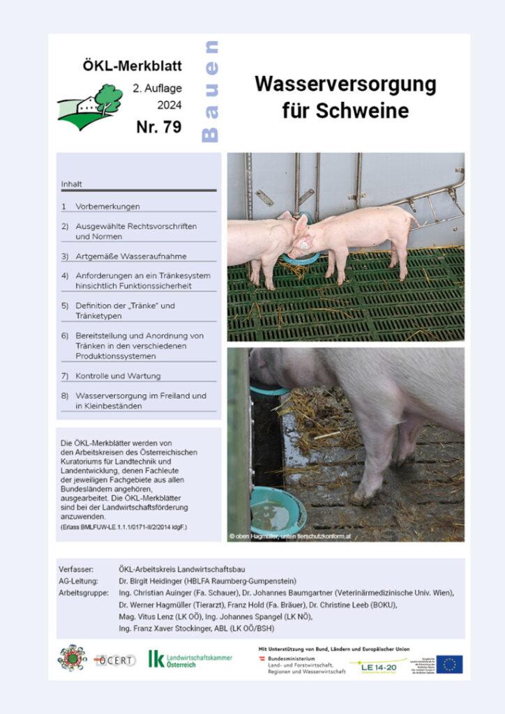 Das in der 2. Auflage erschienene ÖKL-Merkblatt 79 „Wasserversorgung für Schweine“ gibt alle wichtigen Informationen, um eine ausreichende Wasserversorgung für die Tiere zu gewährleisten!