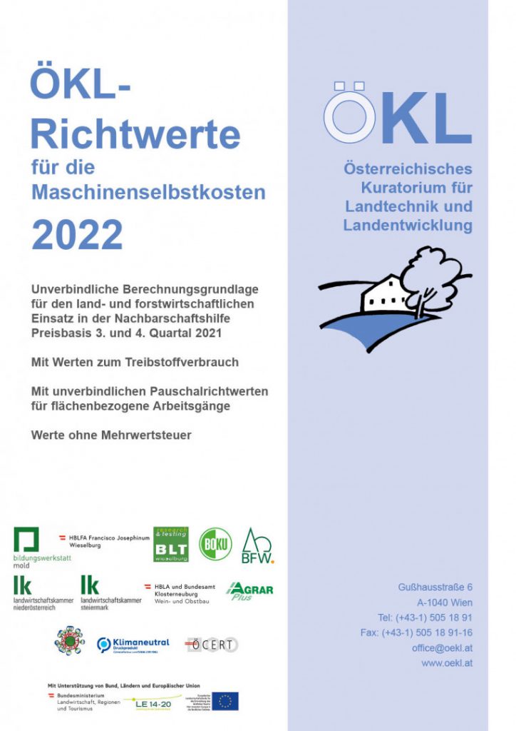 Die ÖKL-Richtwerte 2022 sind als Heft oder als Excel-Tabelle erhältlich. Preis: 15 Euro Bestellungen unter office@oekl.at oder mittels Webshop auf www.oekl.at