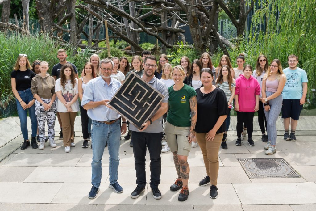 Die Abschlussklasse der Fachrichtung Kleintierhaltung der Landwirtschaftlichen Fachschule (LFS) Hollabrunn plante und baute im heurigen Schuljahr ein ganz besonderes Beschäftigungsspiel für die Orang-Utans im Tiergarten Schönbrunn, bei dem die Tiere Wal- oder Erdnüsse durch ein Labyrinth bis zum einzigen Ausgang schütteln müssen, um an die begehrten Leckerbissen zu kommen. Dieses spezielle Vorhaben wurde im Praxisunterricht mit dem zuständigen Landtechniklehrer Reinhard Dorfwirth umgesetzt und kürzlich feierlich überreicht. Dr. Folko Balfanz (Zoologischer Abteilungsleiter TG Schönbrunn) bedankte sich recht herzlich bei den Schülern: „Wir freuen uns sehr über diese Kooperation mit der Fachschule Hollabrunn und sind begeistert, wie sie unsere Ideen für sogenanntes ‚Tier-Enrichment‘ praktisch umsetzen!“