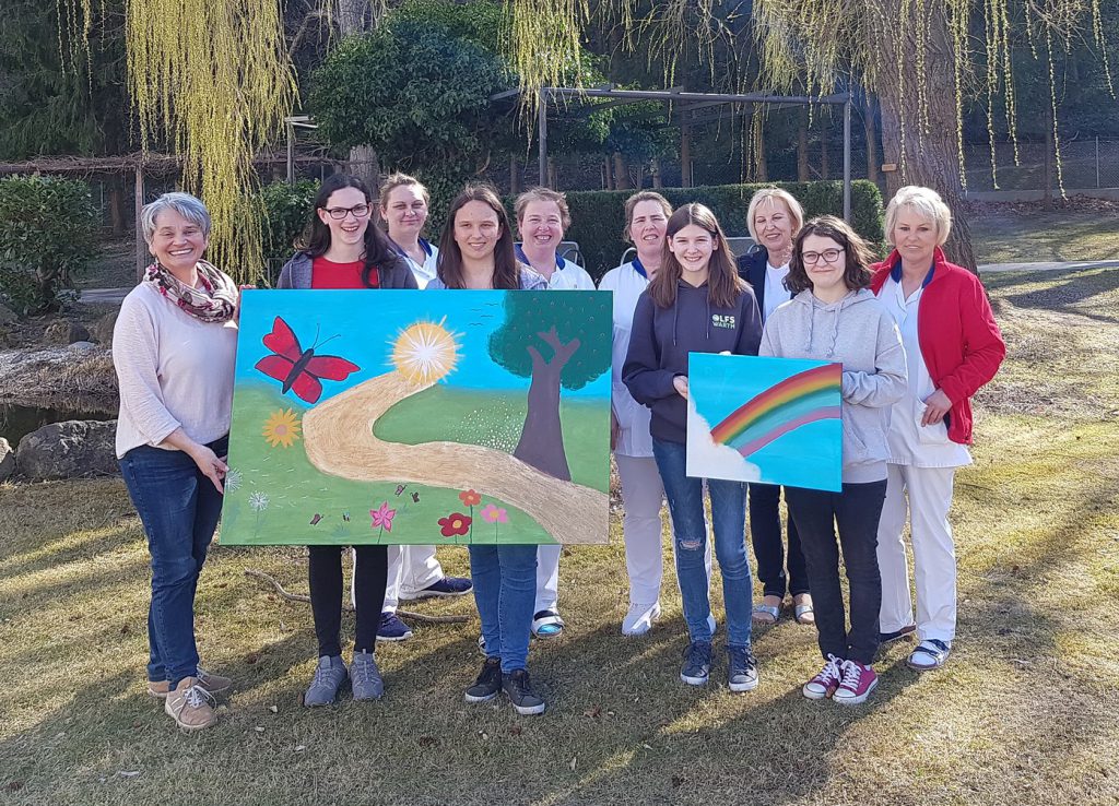 „Die Schülerinnen absolvierten im Rahmen der Ausbildung zur Heimhelferin im Februar einen eintägigen Workshop zur Hospizarbeit. Dabei stand die wertschätzende Haltung im Umgang mit Abschied, Sterben und Trauer im Mittelpunkt“, betont Vortragende Michaela Walla. „Im Zuge des Workshops entstand die Idee für den Verabschiedungsraum im Pflegezentrum Gloggnitz passende Bilder zu malen. Denn die Trauerarbeit braucht Zeit und einen geeigneten Raum mit pietätvoller Atmosphäre, um einen persönlichen Abschied von Verstorbenen zu ermöglichen“, so Walla.