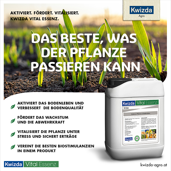 Qualität der Ernte beeinflusst. Um diesen Herausforderungen für Pflanzen entgegenzuwirken, nimmt Kwizda Agro ein neues Biostimulans ins Produktportfolio auf: „Kwizda Vital Essenz“ wirkt unterstützend in allen Kulturen und sorgt für eine optimale Pflanzenentwicklung.