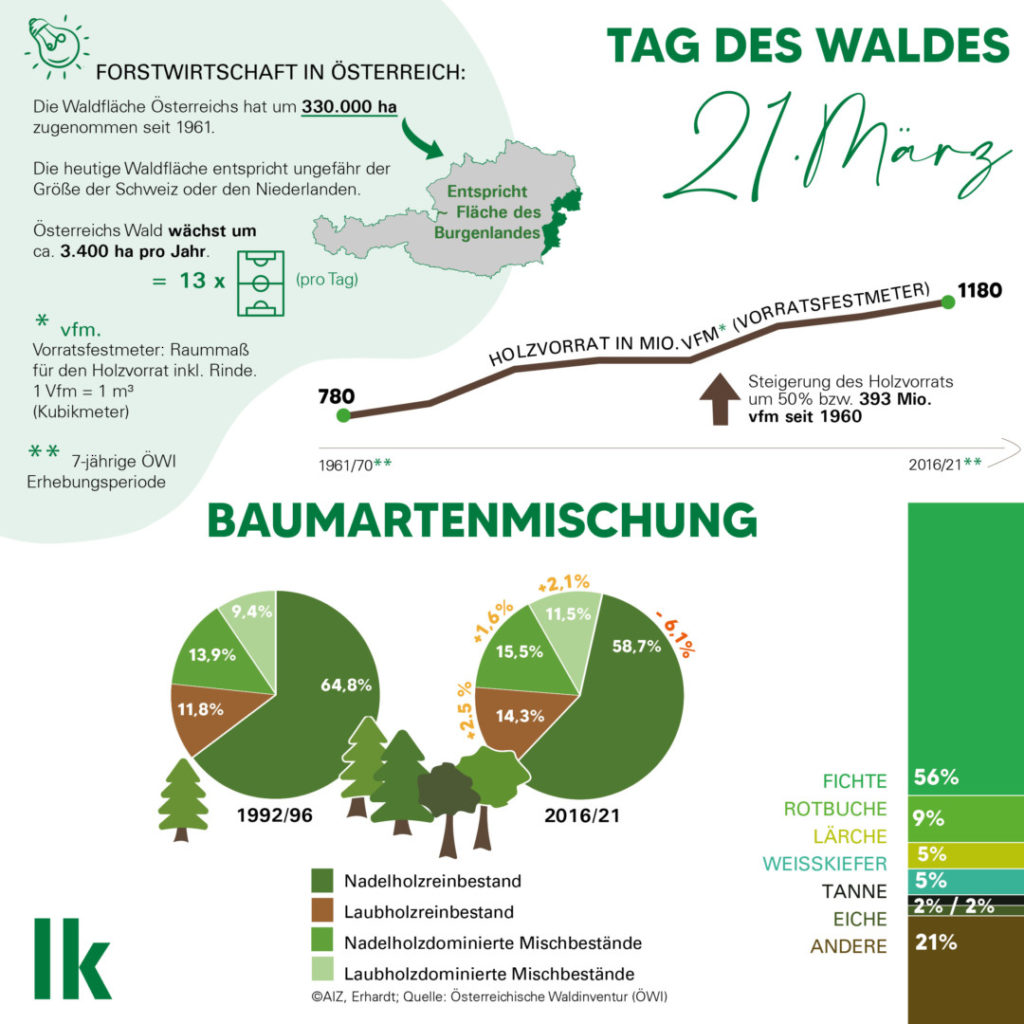 „Unsere Bäume und wir stecken in einer massiven Klimakrise, entschlossenes Handeln ist erforderlich! Sämtliche Wälder jedoch zu Kohlenstoff-Museen verkommen zu lassen und stattdessen weiterhin auf schädliche fossile Energieträger oder Risikotechnologien wie Atomkraft zu setzen, wäre ein fataler Irrweg. Wir müssen das Klimaschutz-Potenzial unserer Wälder vielmehr nachhaltig nutzen, wie auch im Rahmen zahlreicher Studien empfohlen“, betont LKÖ-Präsident Josef Moosbrugger anlässlich des Tages des Waldes am 21.März