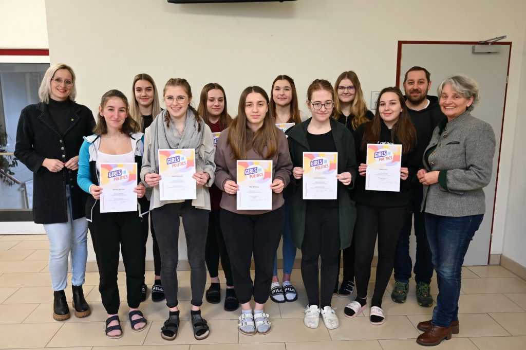 Vor kurzem überreichten die Warther Bürgermeisterin Michaela Walla und Bürgermeisterin Ulrike Trybus aus Altendorf an die Schülerinnen des dritten Jahrgangs des Ausbildungszweigs „Sozialbetreuungsberufe“ die Zertifikate für die Teilnahme am Projekt „Girls in Politics“. Zuvor gab es bei einem Workshop am Gemeindeamt in Warth authentische Einblicke in den Arbeitsalltag der Ortsleiterinnen, wo auch Vizebürgermeisterin Waltraud Ungersböck (Gemeinde Scheiblingkirchen-Thernberg) mit dabei war. Den Jugendlichen wurde somit ein Blick hinter die Kulissen der Kommunalpolitik ermöglicht.