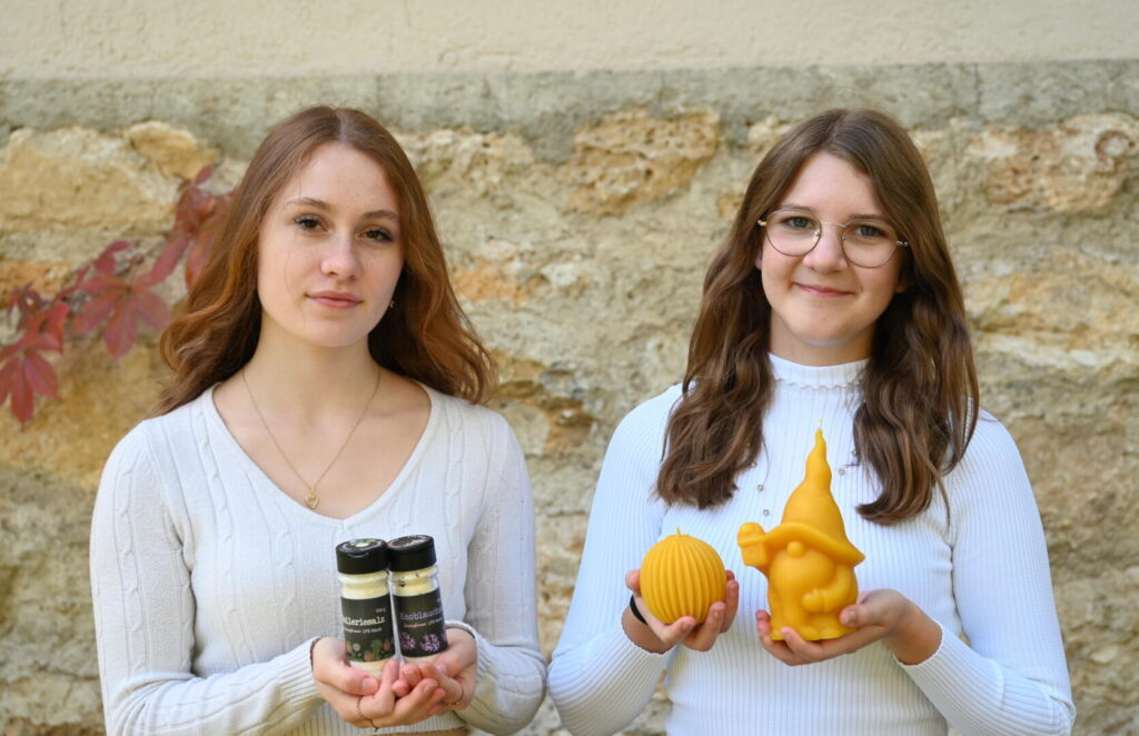„Da die Juniorfirma duftende Kerzen aus Bienenwachs mit Bio-Zertifikat herstellt, arbeiten wir intensiv mit der Imkerschule Warth zusammen, die ja ausschließlich Bio-Honig erzeugt“, betonen die beiden Geschäftsführerinnen Tamara Grundtner und Denies Freistätter. „Das zweite wirtschaftliche Standbein der Firma ist die Erzeugung von Kräutersalzen, die es bislang in fünf Variationen gibt. Ein Salz ist mit Chili verfeinert, eines mit Gewürzen wie Wacholderbeeren, Sellerie, Thymian, Rosmarin, Knoblauch und Karotten sowie ein Kräutersalz“, so die beiden Schülerinnen Grundtner und Freistätter.