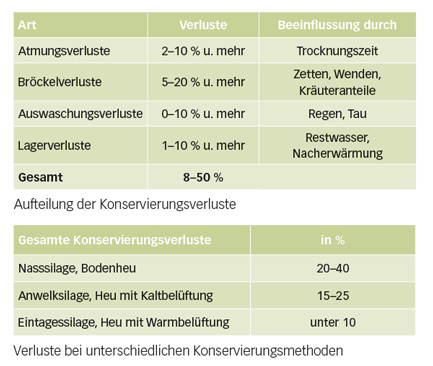 Konservierungsverluste gering halten Ein weiterer Vorteil der Heubelüftung ist der geringere Anfall von Konservierungsverlusten. Bei den Konservierungsverlusten sind in der Praxis die Atmungsverluste nach dem Schnitt und die Bröckelverluste im Zuge der mechanischen Bearbeitung von entscheidender Bedeutung. Sie hängen neben dem Kräuter- und Leguminosenanteil vorrangig von der mechanischen Belastung ab, wobei jeder Arbeitsgang Bröckelverluste bedeutet. Mit zunehmender Trocknung (über 60 % TM) steigen die Bröckelverluste überproportional, weshalb am zweiten Tag das Futter nach Möglichkeit nur noch wenig bearbeitet werden sollte. Bei Bodenheu gehen bei der Ernte um rund 100 kg TM/ha mehr an Bröckelverlusten verloren als bei Belüftungsheu. Zudem sind bei Bodenheu die Energiegehalte häufig um 10 bis 15 % und die Rohproteingehalte um 15 bis 20 % geringer. Alles in allem handelt es sich um Eiweiß- und Energiereserven, die bei der Produktion von Bodenheu nicht genutzt werden.