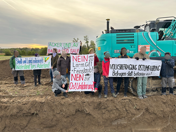 Seit dem 24. September lässt das Land NÖ für den Bau der Ostumfahrung die Bagger rollen. Heute kam es erneut zu Protesten und erstmals auch zu Aktionen durch die lokale Bevölkerung am Südende der Trasse. Mehr als 30 Menschen sind am frühen Morgen auf die Baustelle marschiert und haben diese mit friedlichem Protest zum Erliegen gebracht. Seit fast einem Jahr protestiert ein Bündnis aus lokalen Landwirtinnen, Grundstückseigentümerinnen, Anrainern und Umweltschützern gegen den Bau der „Ostumfahrung“. Durch den Bau der Straße würden ertragreiche Ackerflächen und ein Naherholungsgebiet unwiederbringlich zerstört. Der Widerstand ist ungebrochen.