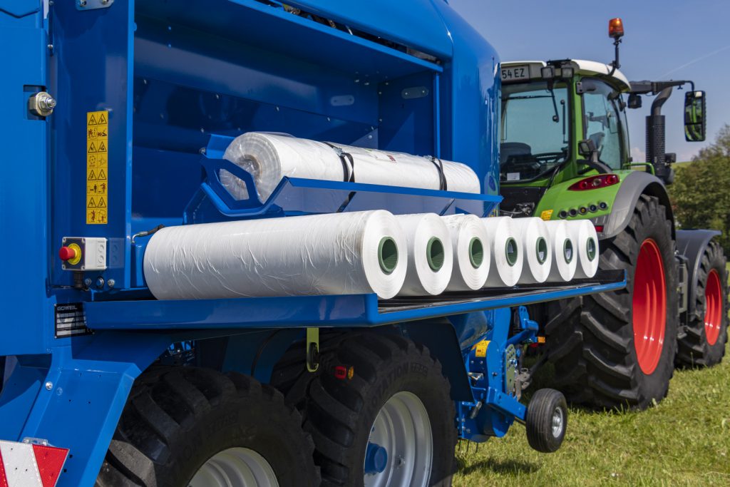 Göweil überarbeitet das Design der Maschine in punkto Optik und Funktionalität. Im geschlossenen, hydraulisch klappbaren Folienmagazin ist Platz für 14 Rollen Wickelfolie sowie 2 Rollen Mantelfolie oder Netz, diese sind vor jeder Witterung und Beschädigung gut geschützt.
